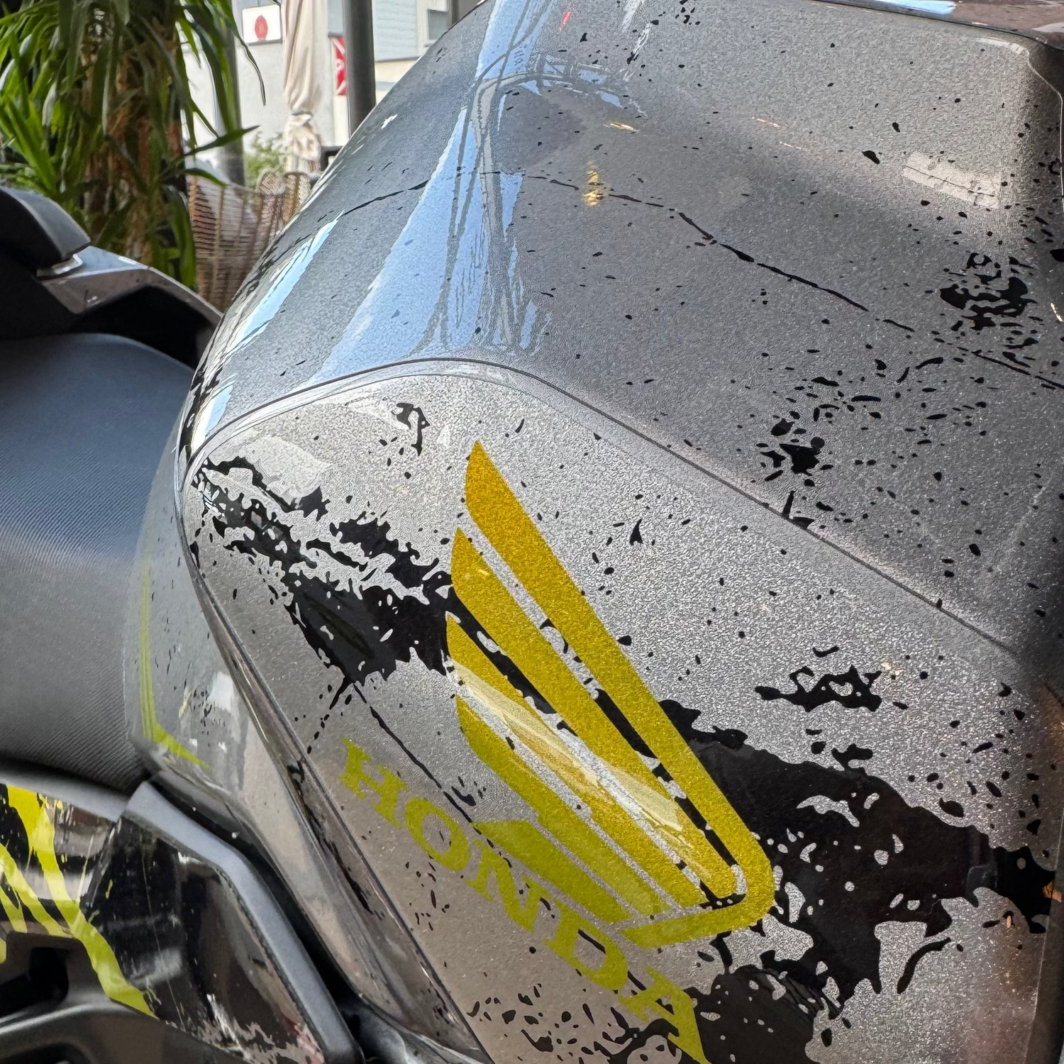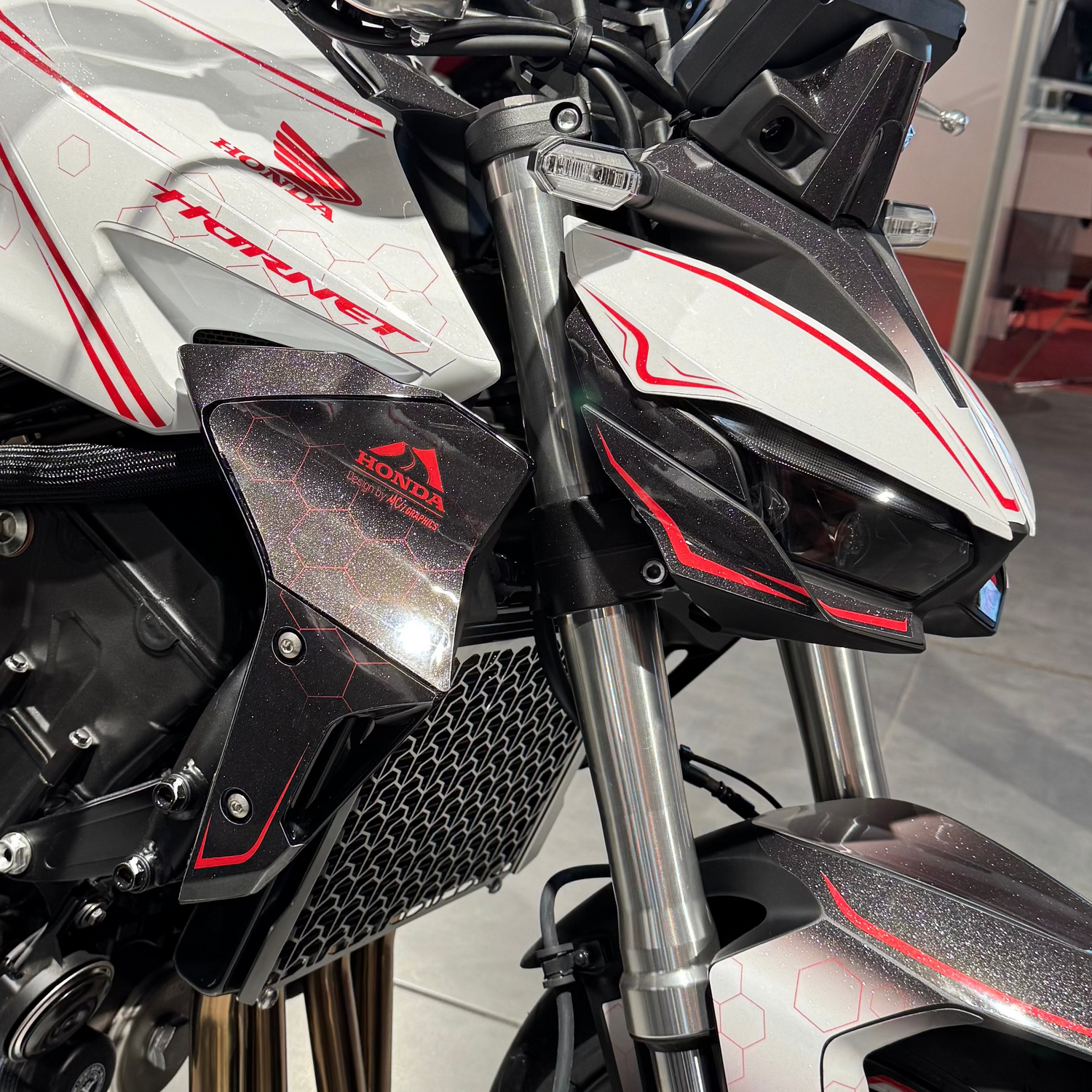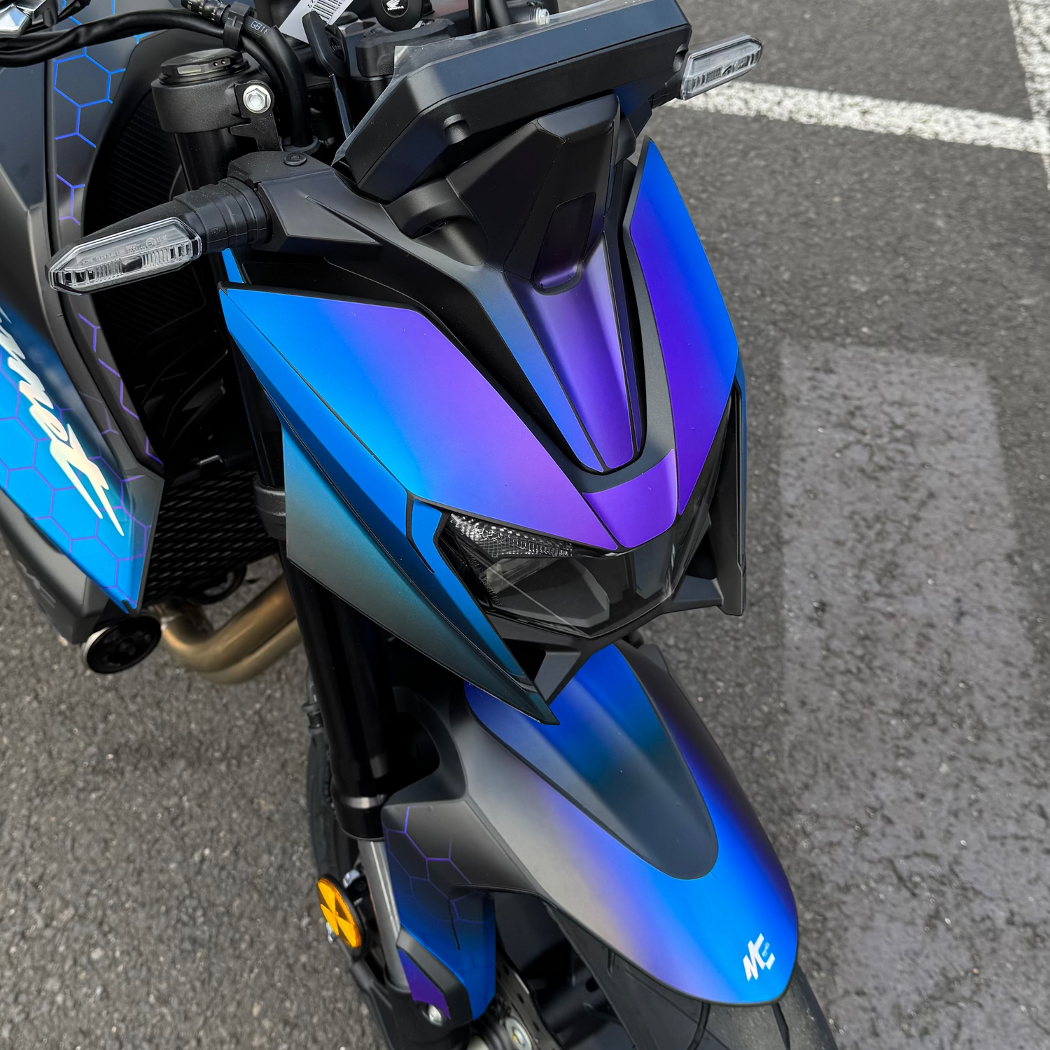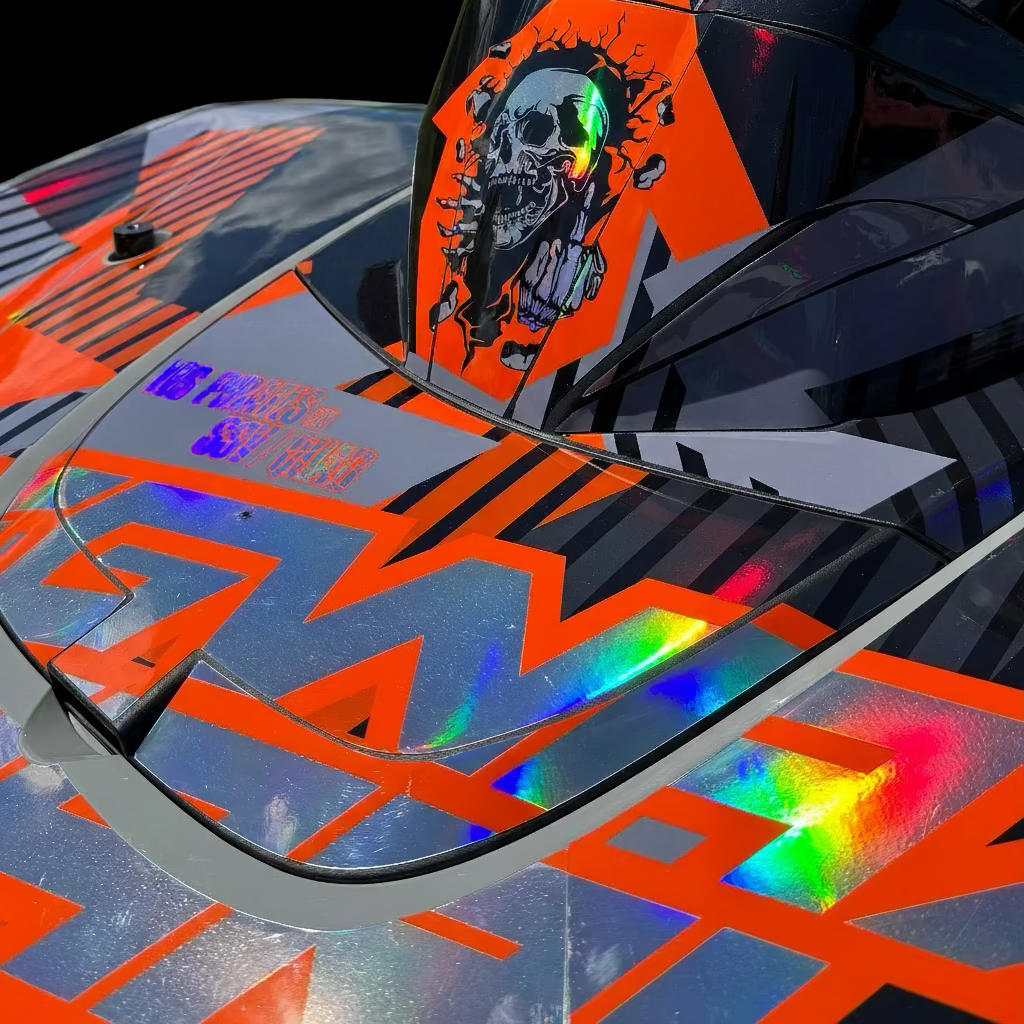 Comme sur la photo ci-contre, on peut voir que le kit déco chrôme holographique présent sur la moto, voit ses effets holographiques retirés sur les parties blanches.