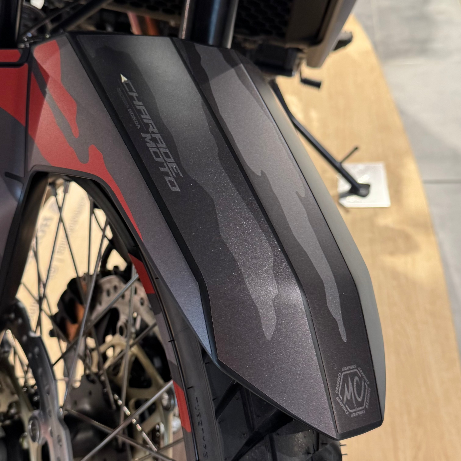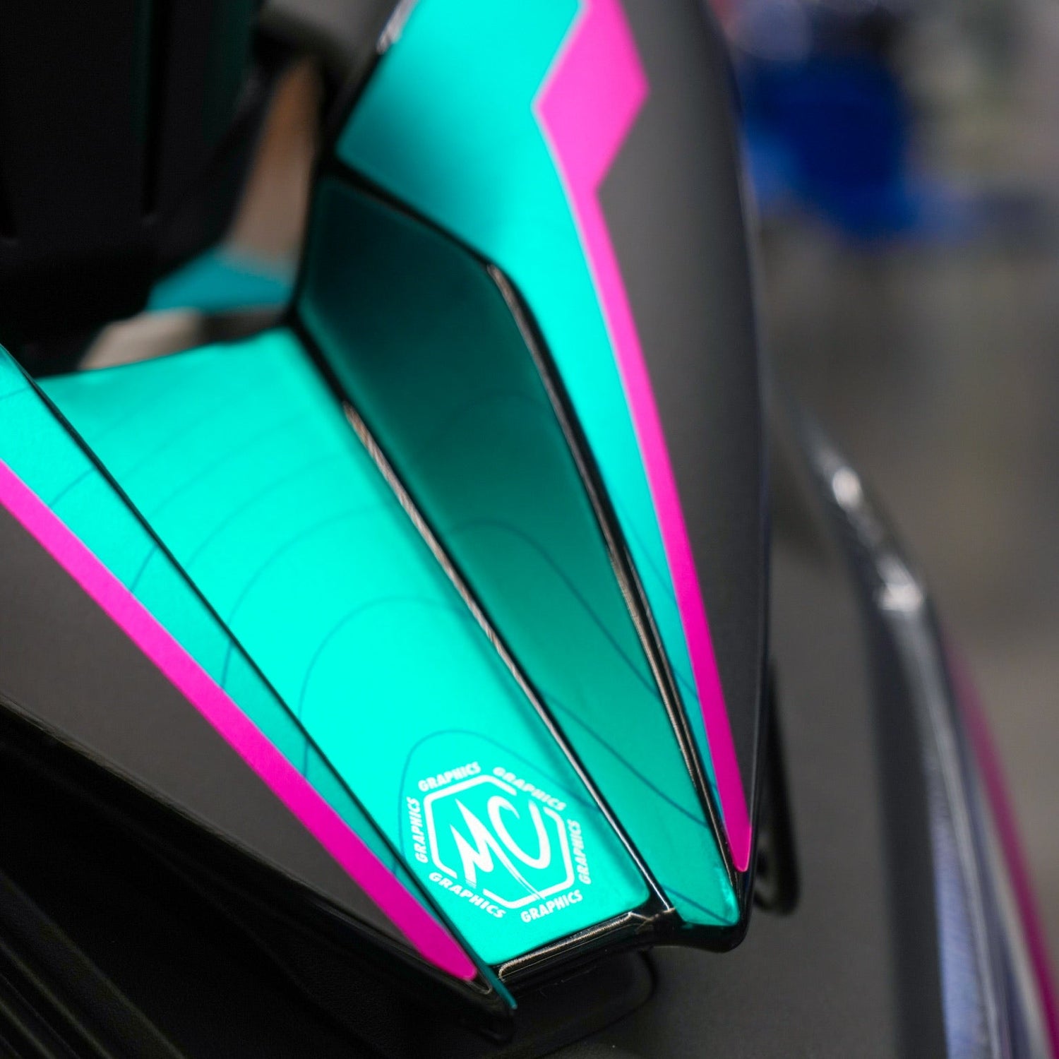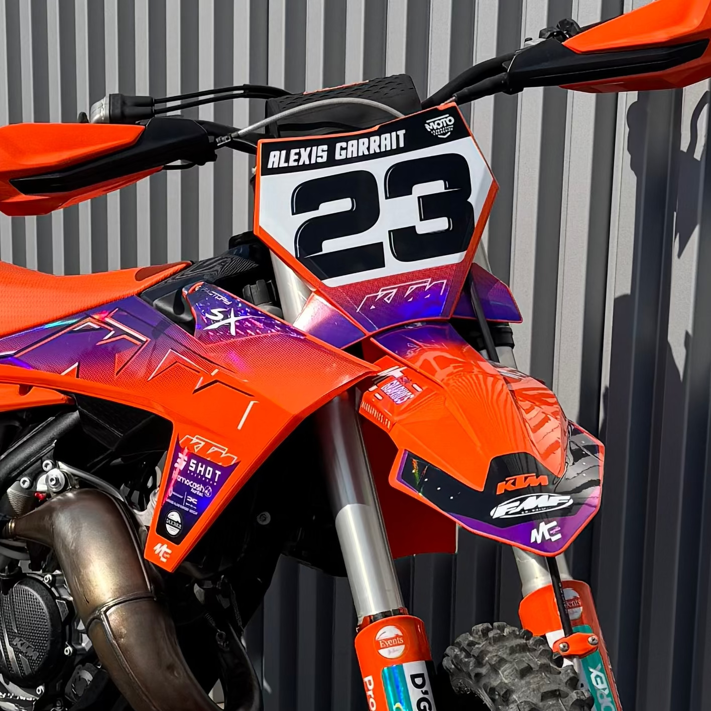 Comme sur la photo ci-contre, on peut voir que le kit déco chrôme holographique présent sur la moto, voit ses effets holographiques retirés sur les parties blanches.