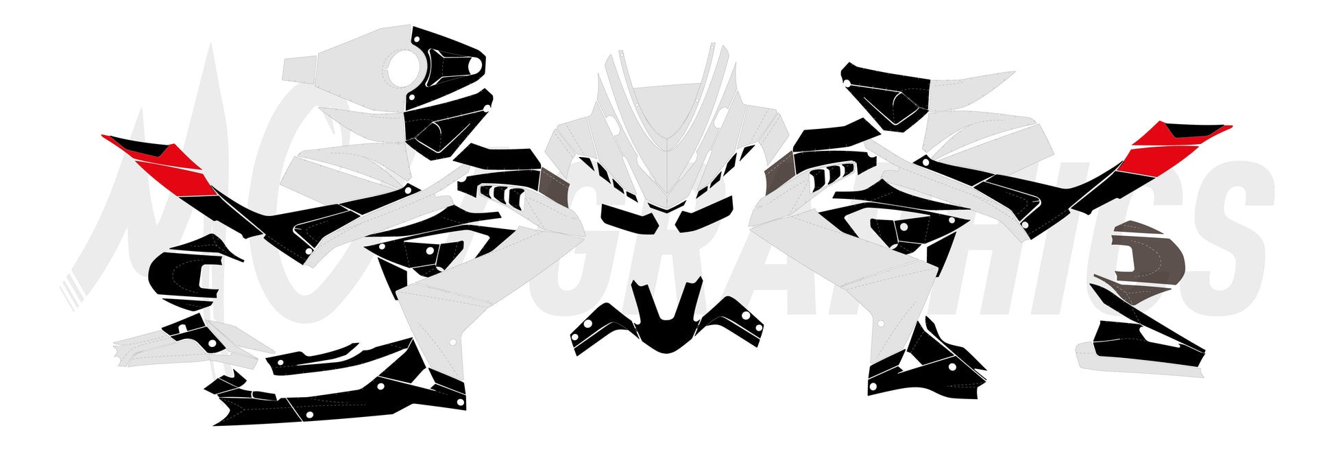 Ce modèle est fait avec un contour de 2 mm pour préparer le modèle à la conception et pour éviter une légère disparité dans le processus de coupe. Pour aider le concepteur, il y a une ligne directrice (en pointillés de gris) sur le modèle qui montre les courbes et les plis en plastique. Cela aide le designer à éviter de placer des logos, etc. dans des zones moins adéquat.